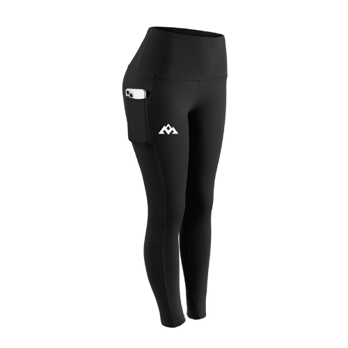 The extra-wide high-waist band sits firmly at your natural waist, providing exceptional core support and a smooth, flattering silhouette that sculpts and holds without digging in or rolling down. The full-length compression fit hugs your legs from waist to ankle, offering muscle support and improving circulation during physical activity. A bold white mountain logo is prominently displayed on the outer thigh, adding a strong brand statement to the clean, minimal all-black design.