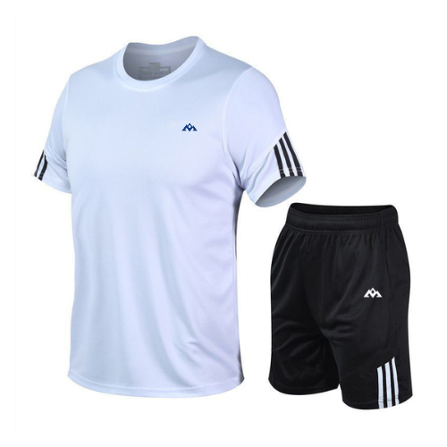 The short-sleeve crew neck t-shirt is crafted from lightweight, breathable performance fabric that sits comfortably against the skin without feeling restrictive. The relaxed yet athletic fit allows full freedom of movement during any activity. A small blue mountain logo is neatly embroidered on the chest, adding a premium brand touch to the clean white design. The standout detail is the three black stripes running down both sleeves — a bold, sporty accent that gives the t-shirt a dynamic, energetic character and pairs perfectly with the matching shorts below.